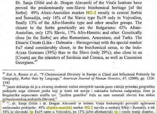 Dr. Sanja Glišić i dr. Dragan Alavantić iz Instituta Vinča biokemijski su potvrdili kod Srba: 49% altajsko-anatolski marker HG-2, tek 16% slavenski tip Eu19 (uglavnom u Vojvodini), 13% južni afrohamitski tip i ostale manje skupine.